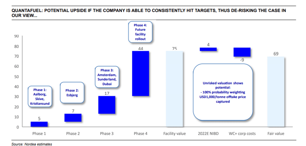 “We base our valuation methodology on deriving cash flows for each Quantafuel facility mentioned in our envisaged rollout in the above section. We assume a WACC of 8% (in line with our choice of WACC for other chemical recyclers we cover). In the next step, we feel it necessary to risk the discounted cash flows of each phase (the first phase being the facilities in construction, the second phase being projects announced and the third phase being the future rollout).