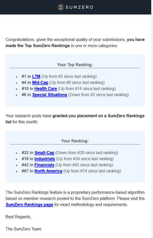 We are proud to announce that we have been ranked the #1 best-performing idea generator by SumZero over the Last Twelve Months (LTM) category.