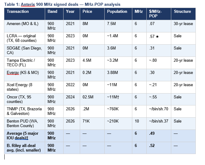- Grain Management paid ~$2.9B for 800 MHz utility-focused spectrum — a comparable low-band transaction at $0.64/MHz-POP versus Anterix’s implied $0.41.