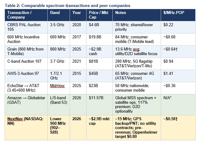 Source: FCC public auction records (Auctions 97, 105, 107); EchoStar SEC Form 8-K (August 2025); Amazon press release (April 14, 2026); Bloomberg; Grain Management press release (March 20, 2025); Broadband Breakfast (April 1, 2026); TradingView/Oppenheimer (April 2026); IEEE ComSoc Technology Blog. † Author’s own MHz-POP calculations. * Amazon/Globalstar not directly comparable due to global MSS licence structure; shown for strategic context only. NextNav (NN): market cap ~$2.9B as of April 2026; estimated 15 MHz contiguous lower 900 MHz spectrum (902–928 MHz); different band and use case from Anterix (PNT/GPS backup vs. broadband); no utility contracts; pre-revenue; shown as 900 MHz band valuation reference only.