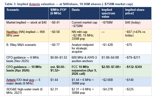 We present three analytical tables. Table 1 shows Anterix’s own signed deals — the most directly comparable transactions. Table 2 provides broader market context, including FCC auctions, the Amazon/Globalstar deal, Grain Management’s 800 MHz acquisition, and the crucial NextNav (NN) peer comparison. Table 3 shows implied company valuation and per-share price across scenarios, all calculated at the current price of $40 and 18.96 million shares outstanding.